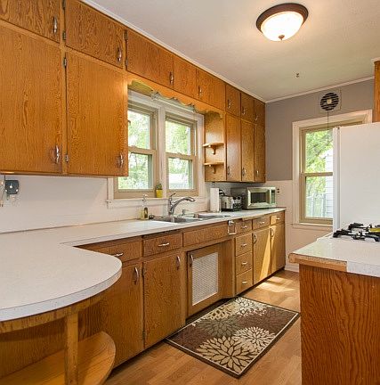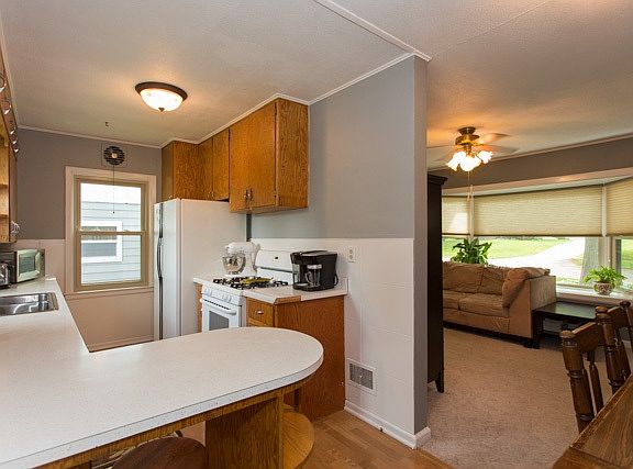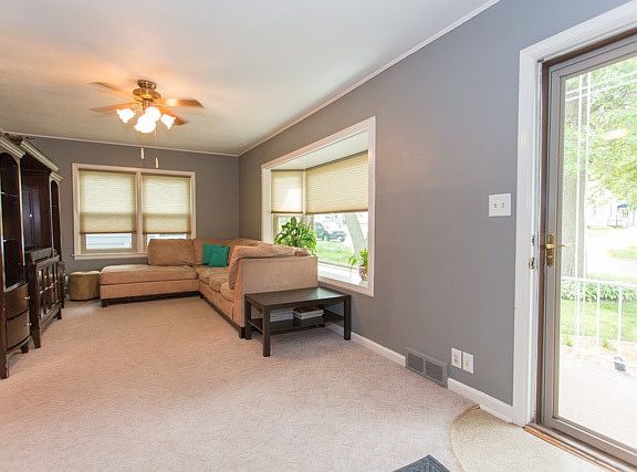 Instantly welcoming! Appealing front entry where you are greeted with stone accents and colorful, blooming perennials. Inside you'll love the open floor plan with a large living room with bow window providing lots of natural light. The kitchen has loads of cabinet space with stove and refrigerator included too! Both bedrooms are spacious and feature oak wood floors. There's bonus 3 season living space on the enclosed back porch perfect for enjoying evening BBQ's on the patio! The lower level is partially finished with some built in cabinetry. Updates include replacement windows and furnace in 2008. Stack washer and dryer will also stay with the house. Outside you'll find a two car garage, a nice size back yard and convenient central location!