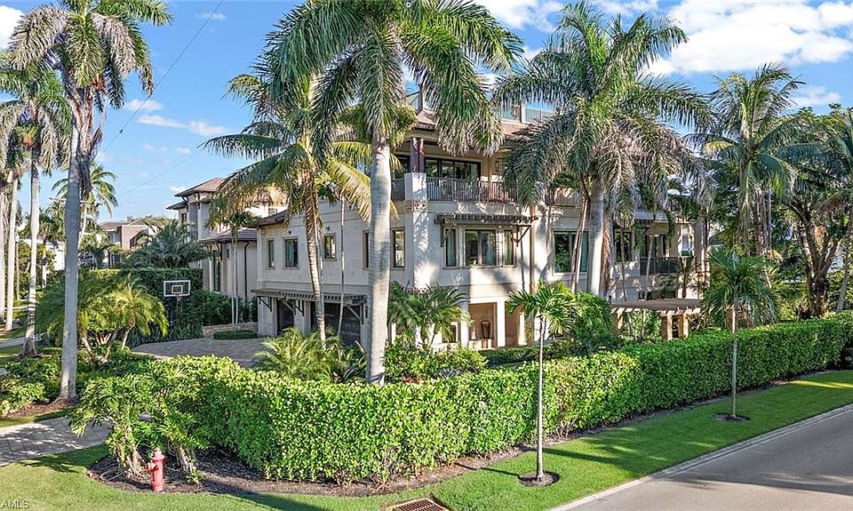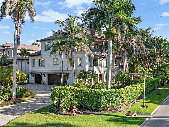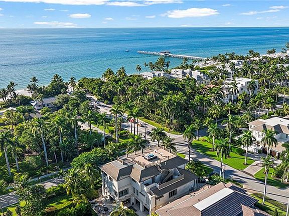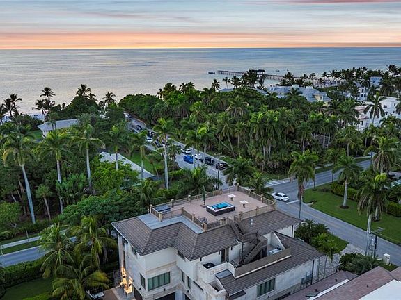 The perfect location in Old Naples, just one block from the beach and two blocks from the fine dining and boutiques of Third Street South. This exceptional all-concrete custom home crafted by Grand Bay Development embodies the best of Naples' luxury living. Featuring 5 bedrooms, 2 dens, plus a flex room off of the pool area and 5 & 1/2 bathrooms. Every detail reflects a commitment to world-class design and craftsmanship, from the curated global finishes to the tropical connection between indoor and outdoor living. The gourmet kitchen adorned with Cristallo Quartzite serves as the heart of the home, with beautiful hardwoods that are increasingly rare, and surrounded by spectacular greenery that creates a sense of privacy and retreat. A custom quartz and agate wet bar opens to the elegant great room, where walls of glass frame western facing terraces. The primary suite offers an elevated sense of serenity with a private balcony with partial gulf views. A rooftop terrace provides panoramic views of the coastline, breathtaking sunsets, and the Naples skyline. The southwest-facing lanai features a vanishing-edge saltwater pool, expansive covered entertaining areas protected by screens and shutters, and meticulously designed tropical landscaping. Combining architectural integrity, global inspiration, and an unmatched location, this residence defines a warm and inviting luxury along the Naples coast.