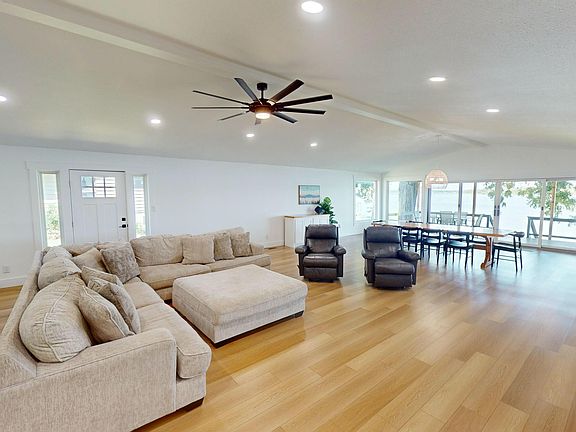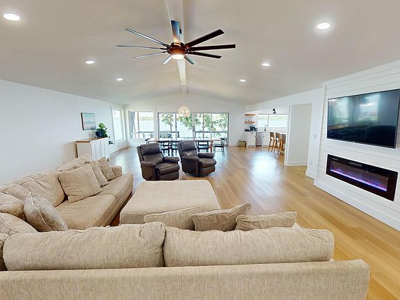 Furnished and beautifully updated 5 bedroom, 3 full bathroom, and 2 car garage home. Home is lake front with open water views. Wolf Creek Location offers stunning views of sailboat bridge and year round events including a 4th of July fireworks show at the Wolf Creek Boat Launching Facility approximately 2 miles away. Interior features include: Hard surface flooring throughout, open concept with great views from living, dining and kitchen, updated colors throughout, updated bathrooms, 2 living areas, built in bunk beds, new cabinets, quartz counter tops and stainless steel appliances to include an ice maker. Exterior features include large deck, gradual entry to water, Approximate summertime dock depth of 8 -10 ft of water, swim platform on dock, newer roof, doors and windows.