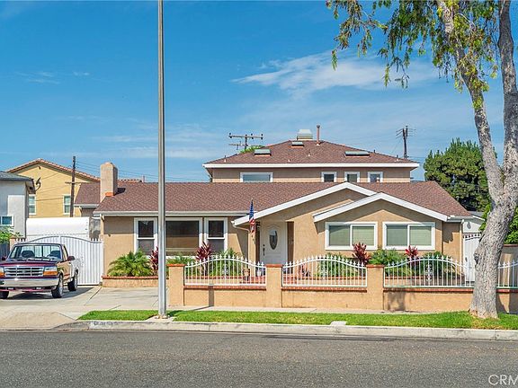 This is the house you've been looking for! Major renovation/addition in 2006 made this a perfect fit for multi generational living as there are 3 bedrooms downstairs, one of which is a primary. There is also a gorgeous 3/4 guest bathroom downstairs. There are 2 primary bedroom suites upstairs, one is much larger with a fireplace, walk in closet and beautiful custom bath. Dark stained oak wood flooring throughout the house, other than tile floors in the kitchen and laundry area. Kitchen has been remodeled in the past for extra working space and a peninsula was added. Off the kitchen is your laundry room with a half bath and exit door to the driveway. Formal dining room is open to the family room, both have sliding glass doors. Family room includes a pool table and a bar. Gentle stairway leading upstairs to the spacious primary bedroom. There is a generous walk in closet leading to the bath. Double sinks, granite counter, skylights and a luxurious soaking jetted tub (you can see Disneyland fireworks from the tub), along with separate walk in 2 headed shower. Both upstairs bedrooms share a balcony along the back portion of the home. The upstairs junior primary suite includes a nicely appointed bath. The oversized garage (height, width and depth) with a 400 amp panel has been specialized for the ultimate 'do it yourselfer' or resident mechanic. The owner has had 6 cars (there were lifts) in the garage, and 6 in the driveway behind the gates. There's room for 3 in front of the gate also getting all the vehicles off the street. There are 40 solar panels on the roof so your electric bills are very reasonable, and there is a dual air conditioning system. Special amenities for your RV also, you have your own dump station and hook ups. This home truly has it all. Down the street from a charter elementary school, and Loara High School.
