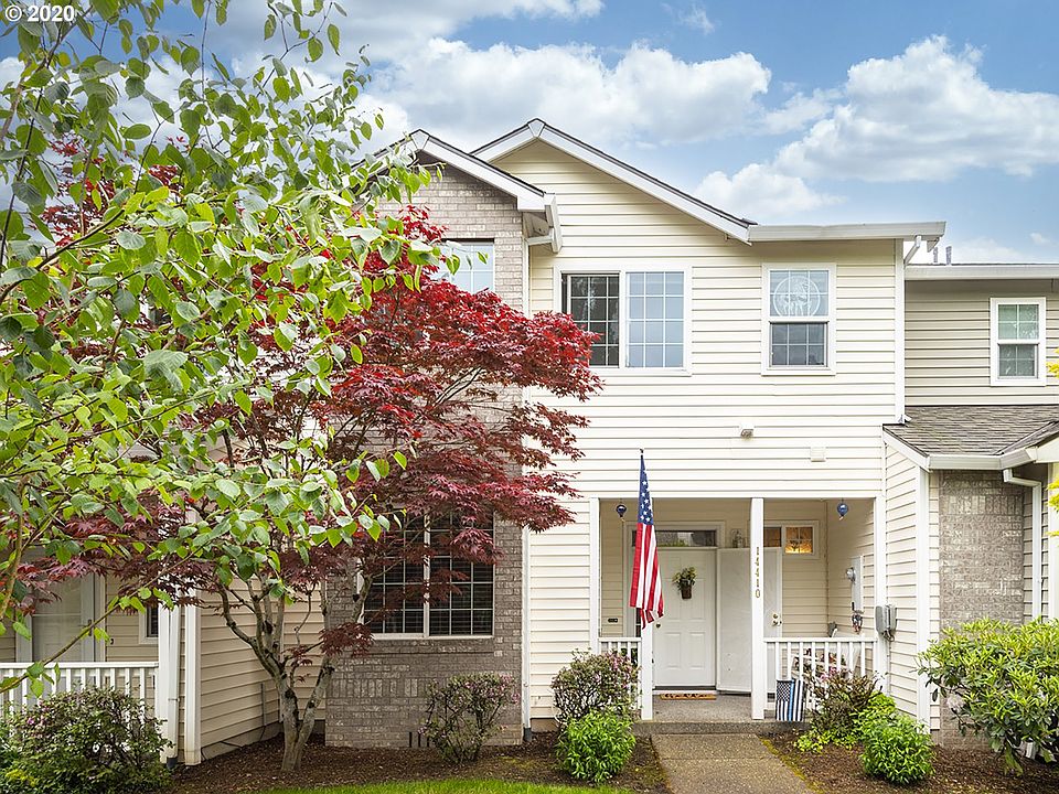 Attractive tree lined street. Lightly lived in and well cared for. Well organized kitchen w/granite, newer SS appliances & 3 double lazy-susans. Great room with vaulted and 9 foot ceilings. Generous master w/bath & walk-in closet. Upstairs laundry. 2nd bedroom and full bath on main. One of the largest private fenced courtyards. Detached double garage. Appliances included. Super convenient location. Walk to public transit, coffee, groceries & Happy Valley Station. Don't miss video walk through.