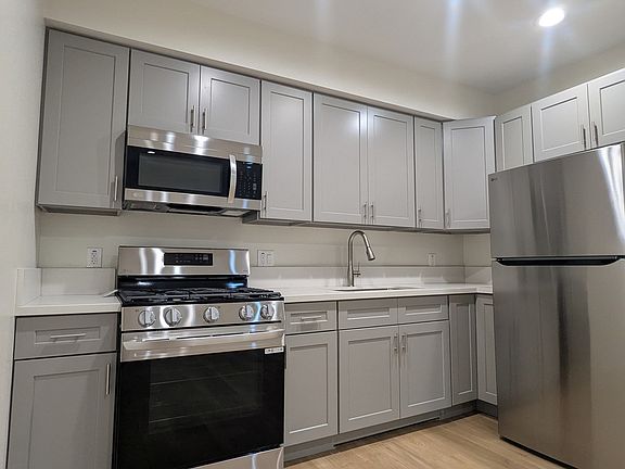 *Modern kitchen with quartz countertops, brand-new stainless steel appliances (gas stove, microwave, refrigerator)