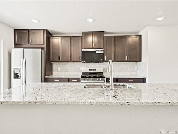Step into the Cameron - a sophisticated 3-bedroom, 3.5-bathroom home designed for luxurious living. This thoughtfully crafted residence features a main-floor office and a private rooftop deck, offering the perfect retreat to soak in Colorado's beauty. Inside, style meets functionality with elegant gray shaker cabinets and durable luxury vinyl plank flooring in the kitchen and great room. The kitchen shines with a striking honeycomb backsplash and sleek granite countertops, creating a space as beautiful as it is practical.