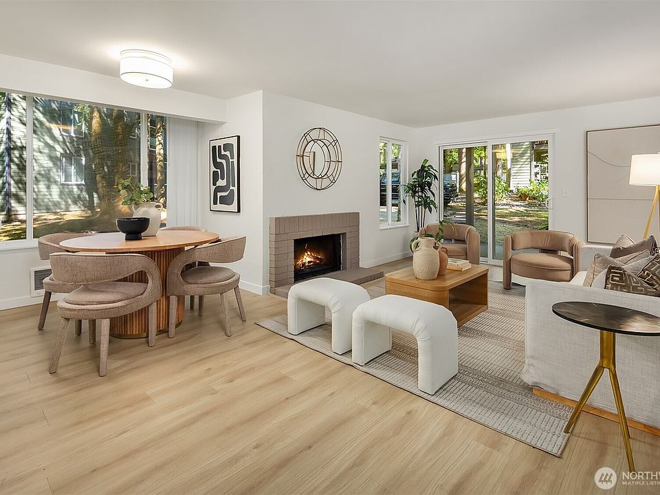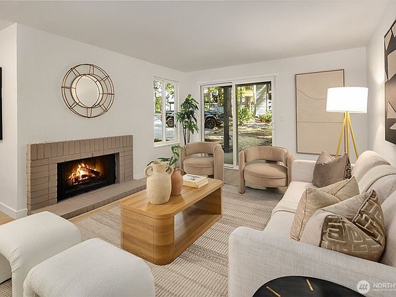 Beautifully renovated 2 Bed / 1.75 bath end unit condo near Microsoft Campus in Bellevue's sought after Eastbridge Condominiums! This coveted move-in ready home features a fully remodeled kitchen & baths w/quartz countertops, ss appliances, new flooring throughout, wood burning fireplace & private deck w/park-like setting. This single story condo lives spaciously with ample closet space, additional storage & in unit washer & dryer. Community features include clubhouse, outdoor pool, reserved covered carport parking & multiple guest spots. Just minutes to Microsoft campus, restaurants, schools, retail & parks with convenient access to 520 and 405. No Rental Cap, healthy HOA & pets allowed, this is a great residence or investment opportunity!