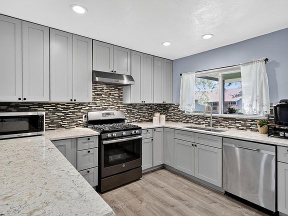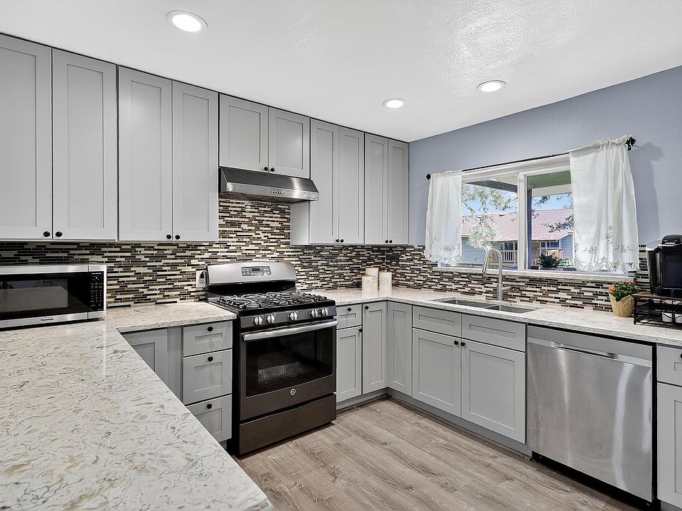Stylish backsplashLarge lotWood flooringFlexible denUpdated cabinetryGranite countersPrimary suite