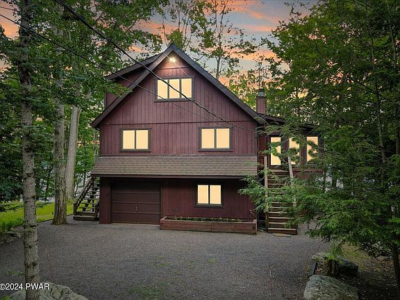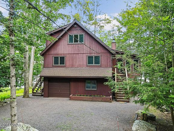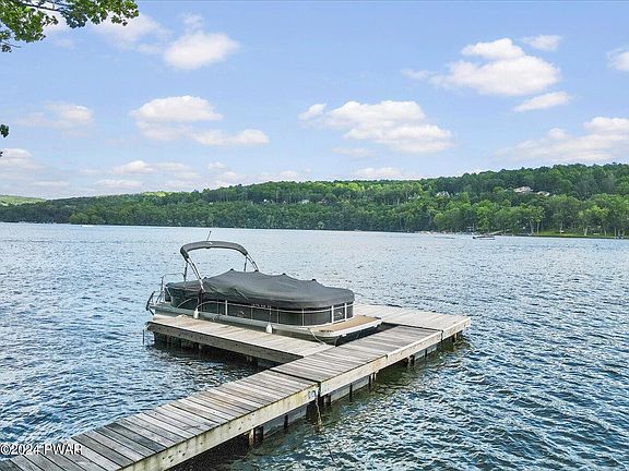 Lake Wallenpaupack lakefront home located in exclusive Lakeland Colony (LCC). 100' of beautiful lakefront with private dock and beautiful views of Burns Island in addition to sweeping 180-degree views of Lake Wallenpaupack. Newly renovated home with 3 bedrooms, 3 full bathrooms, sleeping loft and spacious Game Room/Rec room. Special features include soaring cathedral ceilings and wood accents throughout. Surrounded by over 350 acres of woodlands set aside for member use and enjoyment. This includes multiple trails for hiking, ATV riding, mountain biking, hunting, etc. The house is 0.5 mile walk to a community entrance to the Lacawac Sanctuary. The Sanctuary offers an additional 510 acres of forest with 12 hiking trails.The open floor plan encircles a large stone fireplace with a comfortable great room that has a panoramic view of the lake and surrounding woods. The large kitchen with center island flows beautifully into the great room. There is a large deck with plenty of room for dining, lounging and grilling. A light-filled sunroom offers another relaxing indoor/outdoor haven for everyone to enjoy the beautiful lake view. The lower level consists of a recreational room with gorgeous views of the lake.The backyard features a beautiful canopy of trees providing ample shade on those warm summer days, a large fire-pit for making s'mores with the family, and steps down to the private dock which provides spectacular views of the surrounding area.