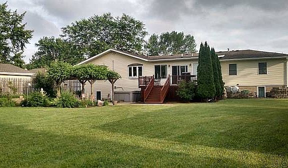 Beautiful Home with over 1/2 acre lot in town. Quiet neighborhood with great neighbors. Large family living room up and down. 2 bathrooms up and 1 down. Huge master bedroom and master bath with walk-in shower. 2 bedrooms up and 1 down. Very nice basement with small bar area and a walk out to trumpet vine covered patio with hot tub. Fancy entry that opens to large dining room with a nice kitchen. Attach 2 car garage and also a detached 2 car garage. 10 x 20 3 seasons porch and 10 x 20 wood deck. 1940 sq ft up and close to 1250 sq ft finished downstairs. Show contact info . Serious qualified buyer only. Will not finance.