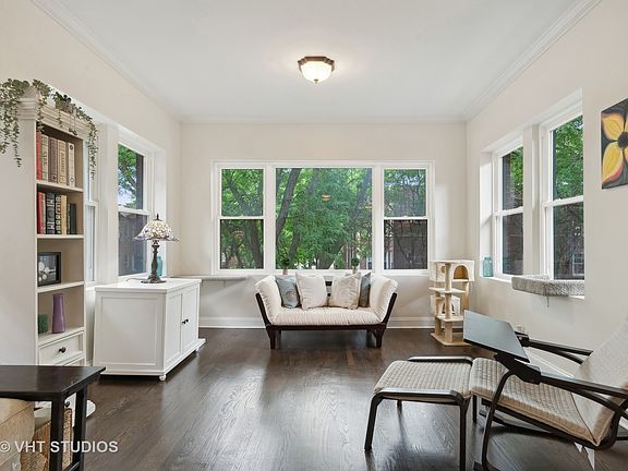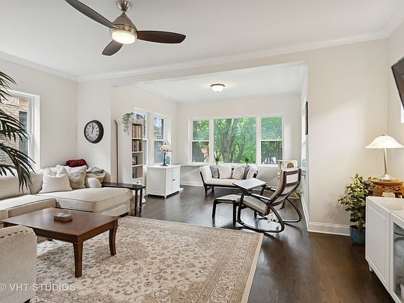 This sunny & spacious 3 bed 2 bath condo in East Rogers Park is nestled on a tree-lined street just one block off Sheridan. The large south-facing sunroom and living room is flooded with natural light. Enjoy updated hardwood floors and high ceilings throughout, custom built shelving in the dining room, and beautifully fresh painted walls. This is an entertainers dream with an open kitchen that opens to an enormous dining room, along with a private deck for grilling. The primary suite has two generous closets and a large bathroom with an inviting spa like shower. Convenient in-unit washer/dryer, an oversized storage room in the basement, and 1 garage parking are included as well. This well maintained building is professionally landscaped, close to Rogers Ave. Beach and the lakefront. Just blocks from the Red Line and public transportation hub, restaurants, LA Fitness and Jewel Osco. Enjoy city living at it's finest in this modern condo.