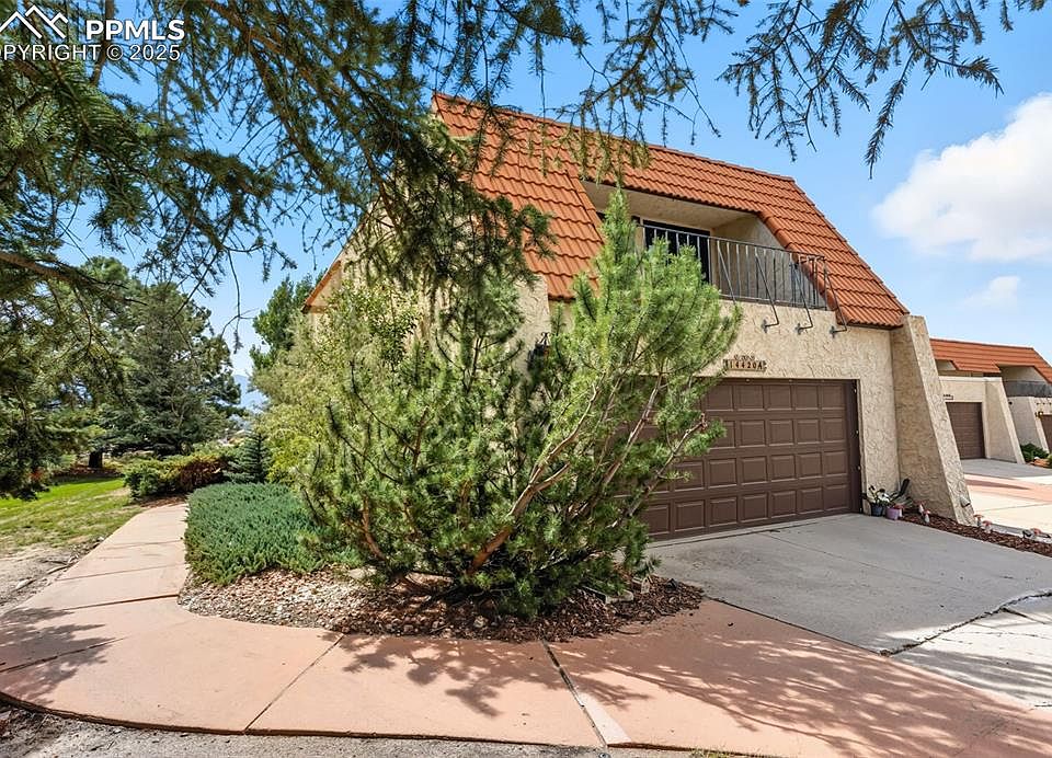 Welcome to this inviting Gleneagle townhome with spectacular mountain views! Step in from the private side entrance to the spacious foyer with oversized powder room and access to the 2-car garage. Venture further into the comfortable living and dining rooms that share a wood-burning fireplace and provide access to the enclosed patio, where you can dine al fresco or relax as you take in the stunning mountain views. The vaulted ceiling provides lots of natural light throughout the living areas. The kitchen features an upgraded breakfast bar, Corian countertops, and a full array of appliances. Retreat upstairs to the primary bedroom showcasing a private balcony and gorgeous mountain views. The expansive primary bedroom features dual closets, a 5-piece ensuite bath, and space for a sitting area or desk. Two more bedrooms each have walk-in closets and feature access to a shared balcony. Rounding out the upstairs is a full bathroom complete with double vanity. This townhome is a perfect blend of retro style and modern convenience. Vintage touches like the ornamental wood beam on the ceiling along the stairway and statement paneled wall in the primary suite make this townhome a rare find. Anderson windows and sliding glass doors allow you to enjoy the mountain views from the comfort of the indoors. Skylights brighten up the space. The recently refinished roof is covered by the HOA. The coveted Club Villa community features serene walking paths and a community pond. It’s conveniently located close to I-25, D-20 schools, the USAFA, and offers easy access to parks, shopping, and restaurants. Schedule your showing to see this charming townhome today!