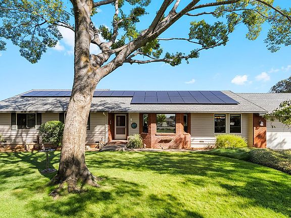Nestled at the end of a quiet cul-de-sac on just over an acre of beautifully treed land, this single-level home offers the perfect balance of privacy, space, and comfort. A picturesque setting surrounded by mature oaks, inside, you'll find a light-filled layout with large picture windows framing serene views of the natural landscape. The open living and dining areas create an inviting atmosphere for gatherings, while the cozy family room provides a warm and relaxed space for everyday living. The well-maintained kitchen offers ample storage, and the adjacent dining area opens effortlessly to the expansive back deck perfect for outdoor dining or morning coffee among the trees. The spacious primary suite includes a soaking tub with views, dual sinks, and plenty of counter space. Two additional bedrooms and a full guest bath provide flexibility for family, guests, or a home office. Outside, the expansive deck stretches along the back of the home, offering generous space for outdoor dining and relaxation.There's plenty of room to garden, play, or simply unwind. A new roof and solar system complete with battery backup and EV car charger provide modern efficiency and underground utilities - meaning no overhead power lines, clearer view and enhanced reliability.
