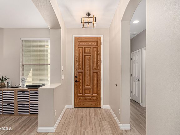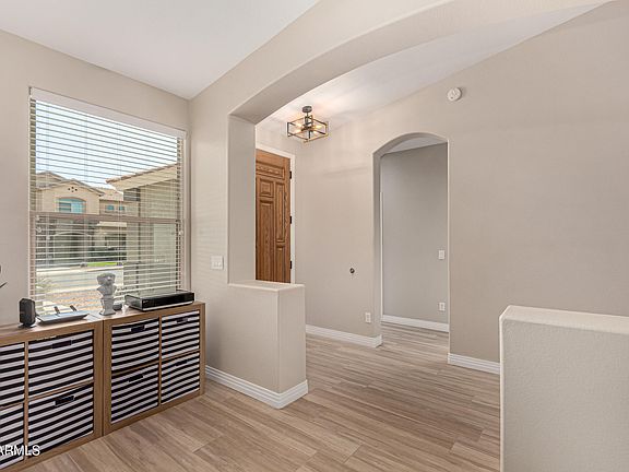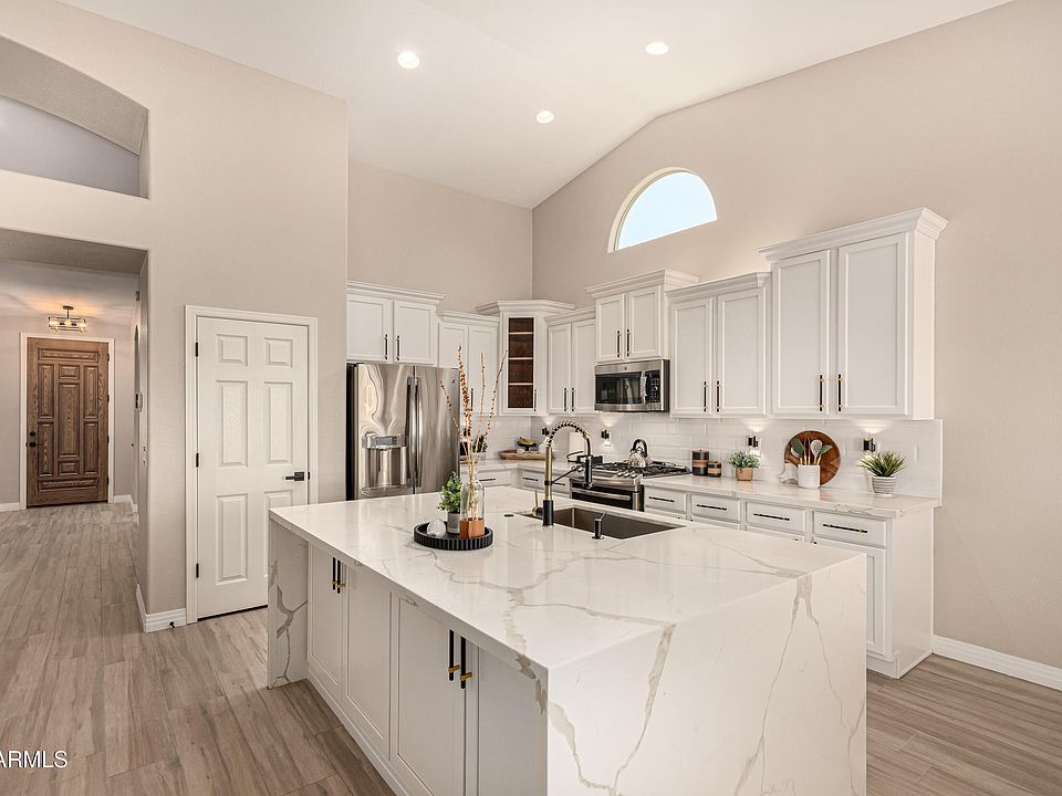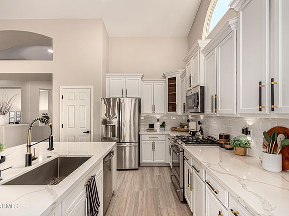 A RARE FIND!! This move-in ready home is defined by its exquisitely REMODELED KITCHEN showcasing a redesigned waterfall quartz island, stacked cabinetry with crown molding, designer backsplash, and a custom pantry. Step through the striking front door into soaring vaulted ceilings and an open layout flowing with elegant wood-look tile. The split floorplan offers privacy, with spacious bedrooms and a versatile den/office, perfect for work or hobbies. The great room flows seamlessly to the kitchen, ideal for entertaining. A 3-car tandem garage adds flexibility, while recent upgrades include a new HVAC, water heater and MORE. OWNED SOLAR keeps your APS bills under $30/month year-round, pairing efficiency with luxury. Quiet street yet minutes from all the new shopping, dining, & recreation! A rare find, this exquisitely remodeled home blends modern elegance with everyday comfort. At its heart is a chef's kitchen designed to impress, a dramatic waterfall quartz island commands attention, surrounded by stacked cabinetry with crown molding, a striking designer backsplash, and a custom pantry that elevates both style and storage.