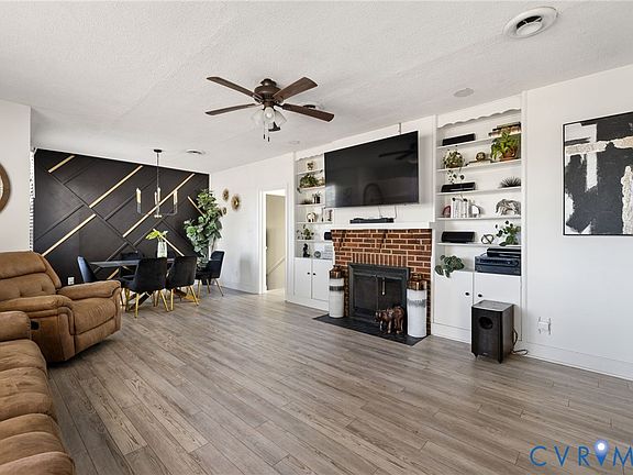 Enjoy comfortable living in this ranch-style home on a generous .40-acre corner lot in the Chester (Enon) area, featuring a spacious layout and great outdoor space. The fully fenced backyard is perfect for entertaining, relaxing, or gardening, complete with a newer patio, detached garage, storage shed, and a partial vinyl privacy fence. Inside, you’ll find a large living room with laminate flooring, a wood-burning fireplace surrounded by built-in bookshelves, and an open flow into the dining area highlighted by a stylish accent wall. The kitchen offers plenty of cabinet space, quartz countertops, a tile backsplash, recessed lighting, and stainless steel appliances. A convenient laundry area with shelving is located off the kitchen. On one side of the home, you’ll find two spacious bedrooms and a beautifully updated hall bath featuring a double vanity, tile floors, and a tiled shower surround. From the kitchen, step down into a flex space or third bedroom with a walk-in closet and direct access to the backyard, perfect for guests, a home office, or a cozy retreat. With its spacious layout and prime Chester location, this home provides everyday ease—steps from Enon Elementary School and close to shopping, dining, and major interstates. The location also offers quick access to Point of Rocks Park, the Chester Amazon Fulfillment Center, Fort Gregg-Adams, and the Village of Chester, with historic Beacon Theatre and riverfront dining at The Boathouse just over the bridge in Hopewell.