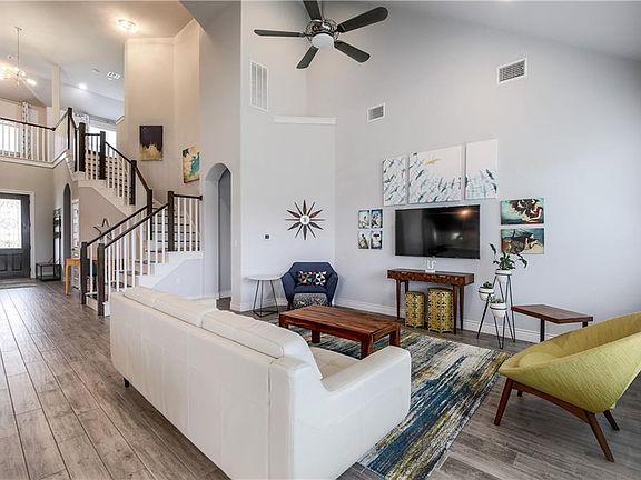 Move-in ready, East facing home with soaring two story ceilings and an abundance of natural light. Robust solar panel system with transferable 25 year warranty for a huge reduction in electricity cost. Open floorplan with large, picture windows in living and breakfast area overlooking the pond. Chef's kitchen with pendant lighting over island, quartz counters, stainless steel appliances, gas cooktop, vented exhaust fan, built-in oven and microwave. Allergy friendly with no carpet. Ceramic, wood look tile throughout and wood stairs with elegant white risers. Ideal setup for school and work from home. Downstairs home office has extra sound proofing. Upstairs game room is perfect for desks and TV/hangout room for kids. Built-in wireless access points for excellent WiFi coverage throughout home. Fiber internet ready. Bedrooms, bathrooms and office have solid wood doors for more noise reduction while everyone is at home. Main level, master bedroom suite with gambrel ceiling, dual vanity, brushed nickel finishes and frameless shower door. Downstairs master bedroom plus extra bedroom and full bath - perfect for guests or parents. Upstairs, there are two oversized bedrooms with jack and jill bath. Walk to highly rated neighborhood elementary and middle school. Easy access to 45 and MetroRail.