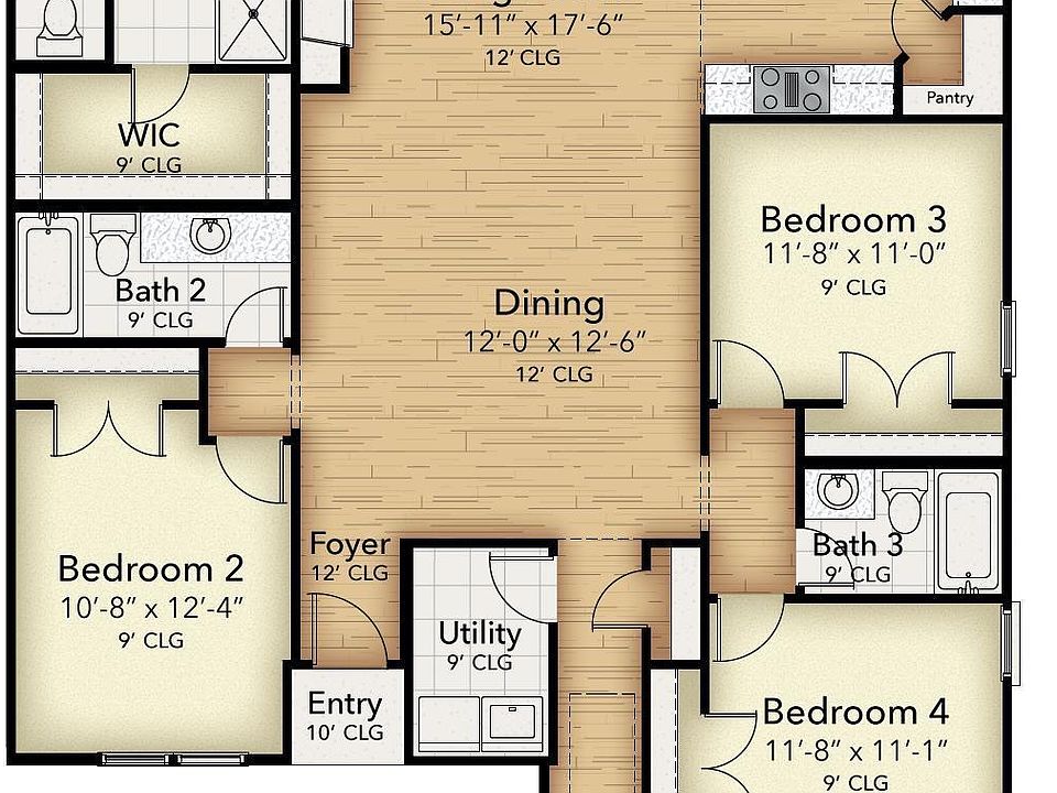 The Chester plan is a 4bed/3bath single story home offering open and spacious living areas with 12' high ceilings. Adjacent living and dining areas with wall of windows to back yard. LVT floors and oversized ceramic throughout with carpet in the bedrooms. Gourmet kitchen features keeping area, chef's island, GE stainless steel smart appliances, gas cooktop, separate wall oven and walk-in pantry. Private Master bedroom has en-suite bathroom with dual vanities, walk-in shower, garden tub, WC, and walk-in closet. 3cm granite counters in kitchen and all baths.