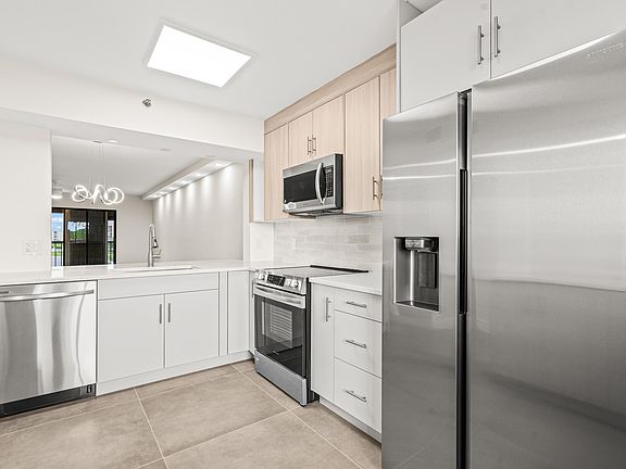 Long waterfront viewLarge porcelain tileSmooth ceilingNew stainless steel appliancesDesigner european style kitchen