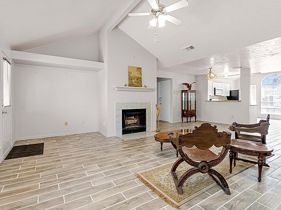 Welcome to this adorable single-story home. Tile flooring throughout, high ceilings, and light and bright. Spacious den with vaulted ceiling, gas fireplace, and views of the backyard. The kitchen was updated in 2022 with Stainless steel appliances and countertops. The inviting large windows and a high ceiling in the breakfast area offers a relaxing spot for morning coffee. A convenient Pass-through to the dining room makes entertaining easy. Primary bedroom with crown molding and includes an updated bathroom offering a Stand-alone shower, Separate tub, double sinks, and walk-in closet. On the opposite side of the home, you will find the secondary bedrooms, and with an updated bathroom between. Backyard shaded with large trees offers an extended patio perfect for entertaining and relaxing. This home includes a washer, dryer, and refrigerator. The Roof was replaced approximately 2017.