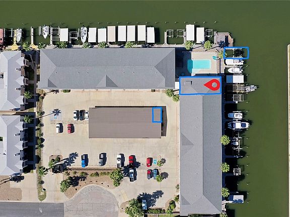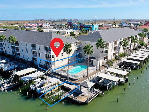 Poolside Padre Island Condo on a canal with a boat lift and a car garage! This two bedroom, two full bath, ground floor unit is all on one level and ready for your investment or residential purchase. The living area opens out to its own first floor covered deck overlooking the water. Full kitchen with stainless appliances and granite countertops.