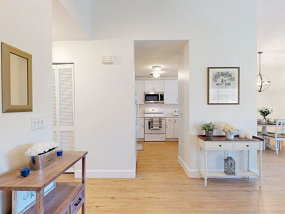 Move-In Ready! Beautifully updated 3-bedroom, 2-bathroom villa with a 1-car garage, offering a perfect blend of comfort and convenience. Designed for modern living, this home features an open-concept floor plan with abundant natural light and modern upgrades. The newly remodeled kitchen boasts a pantry, and quartz counters. New luxury vinyl laminate flooring in the living areas. Sliders open to a fully screened private patio perfect for relaxation or entertaining. The large primary suite features a walk-in closet. The updated primary bathroom has double vanities and a separate water closet. There is an in-unit washer/dryer and two closets in the guest bathroom. The roof was replaced in 2023 and the unit was painted in April. Located in a highly desirable community, residents enjoy access to two pools (one heated and cooled), a clubhouse, and a scenic walking path around the lake. The HOA fee includes exterior insurance, lawn care, and amenities. Perfectly situated minutes from the beach, downtown, shopping, dining, parks, and medical facilities, this home offers an unbeatable location. Don't miss out! Schedule your private showing today!