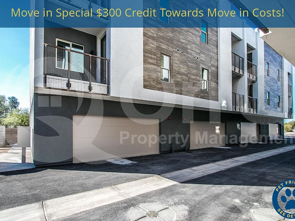Thoughtfully designed 3-bedroom, 3.5-bath townhome in Phoenix's Anderson Row complex. This home is FULL of modern upgrades and fixtures. Gorgeous eat-in kitchen features quartz countertops, elegant white shaker cabinets, black hardware, a breakfast bar, and stainless steel appliances! Enjoy vinyl wood plank flooring, 10ft ceilings, neutral paint, and tons of natural light throughout! With a separate dining area and a ground-level flexible office/den, this home has an ample amount of living and entertaining space! The top floor primary suite includes an oversized walk-in closet, double sinks, a large shower, and a private balcony. In unit laundry with included washer/dryer! 2 car garage! Great location in the heart of Midtown!