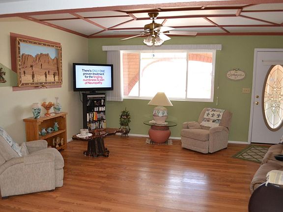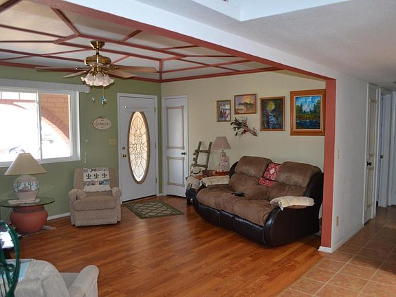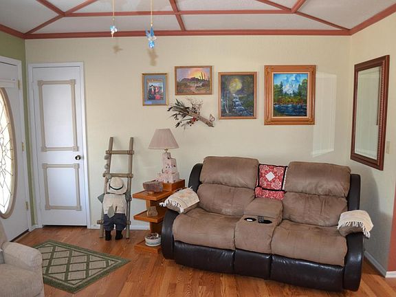 This spacious 2 bedroom, 2 full bathrooms, Very updated with new eat-in kitchen, Double oven glass top stove, Built in microwave, Raised dishwasher w/ storage underneath, Formal Dining room, Large great room with open floor plan, Ornamental front door, Laminated Hard wood and tile floors throughout, 3 skylights, large AZ Room and Laundry w/ separate heat pump and storage cabinets, Double garage with storage cabinets, 10x12 storage shed plus 10x12 shop with benches, both on concrete floors, awning covered rear patio with water fountain, newer hot water heater, All house water softener, RO System, lots of closet space. Privacy stucco Fence with R.V. Gate, New paint inside & out, Vinylclad removable thermopane windows throughout, 16'' blown insulation. 55+ Community with Optional HOACompletely maintenance free landscaping landscaping. This house is a very well maintained home that has many quality updates that sets this house apart from all other homes in the area.