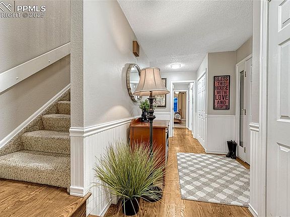 Wanting something that feels like home? Cozy? Inviting? Spacious? Look no further. 6 generously sized bedrooms and 4 bathrooms provide ample room for family living and entertaining. Located on .37 of an acre, this corner lot has many wonderful areas for play! South facing deck to enjoy coffee or sunset cocktails. On the main level, take advantage of one bedroom and two living areas that invoke comfort. This home boasts sleek new stone countertops, offering a stylish and functional kitchen and bathrooms. Upstairs enjoy a great jack and jill bathroom with bluetooth speakers within the lighting! The four bedrooms upstairs each have built in shelving too! Enjoy the elegance of newly refinished floors and tastefully painted walls throughout. Three beautiful gas fireplaces enhance the home's cozy, welcoming atmosphere. The downstairs walkout basement is where the fun begins! Large recreation area with LVP and an office and bedroom with ample storage. Step outside to find mature landscaping and an inviting outdoor space perfect for relaxation or entertaining. Close to the Air Force Academy, shopping, trails and I-25. This truly is one of those homes when you walk in, your heart is happy.