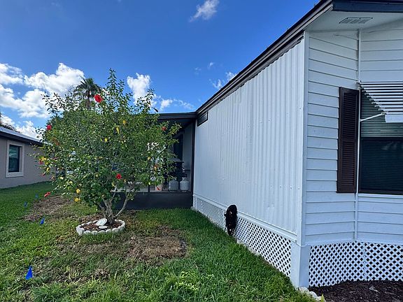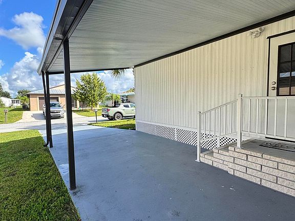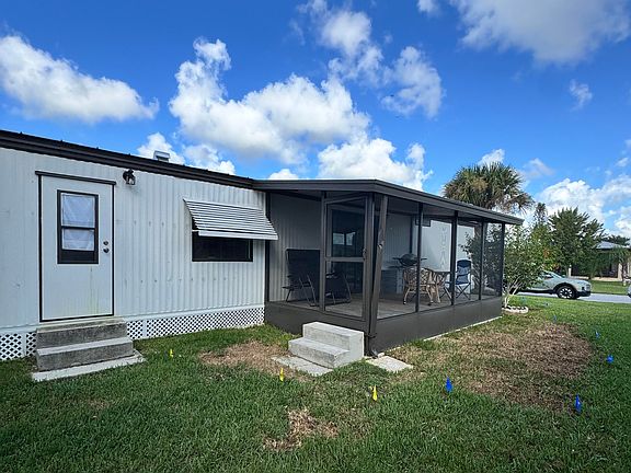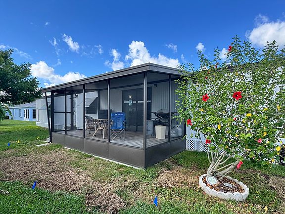 Lovely 2-bedroom 2-bath home in the 55+ Spanish Lakes Fairways community. This home features an open eat-in kitchen with newer appliances and a bar that provides extra seating. The home features a split floor plan for added privacy when entertaining guests. A peaceful screened-in patio is excellent for morning coffee or evening cocktails. Tranquil street. New standing seam metal roof (2024), Vapor barrier (2024). Laminate flooring throughout, no carpet. Bathrooms feature new fiberglass showers, ceiling fans, ceiling vents, and seals. The exterior and Interior are newly painted. Home is being sold unfurnished. Lawn care, trash removal, and golf are included in the lot rent. The community features two pools, tennis, pickleball, bocce ball, shuffleboard, and many other amenities.
