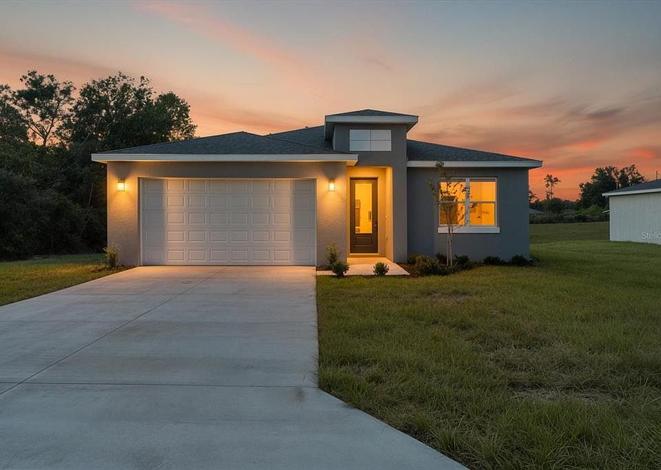 This is the home you have been waiting on, an impeccable designed 4-bedroom 3-bathroom situated on private lot with no rear neighbors in a central location in the Marion Oaks Community. From the moment you arrive you will notice the difference with top-of-the-line modern craftsmanship and striking Builder upgrades like Waterproof LVP flooring throughout (NO CARPET), All custom order SOLID CORE factory black doors, chic matte black fixtures, and outdoor security flood lights. The stunningly designed kitchen showcases 42'' upper cabinets, statement piece entertaining island, Calacatta White Quartz countertops, Samsung stainless steel appliance suite, glass backsplash, and an oversized walk-in pantry. The main living space has tons of natural light, and the open concept is perfect for entertaining family and friends. The Owner’s Suite showcases dual sink vanity, chic shower with glass enclosure, and walk-in closet. The guest bedrooms are roomy, with both Guest Bathrooms featuring designer floor to ceiling tile and Bathtub/Shower combo. Indoor Laundry has plenty of storage and Samsung washer & dryer are included as well. The French doors lead out to the fully covered lanai which is the perfect extension of the homes living space for enjoying the beautiful Florida sunshine. BUILDER INCENTIVES available including CLOSING COST assistance and interest rate BuyDown! Inquire about our available programs. Schedule your private showing today and experience why this home set it’s apart from all the others!