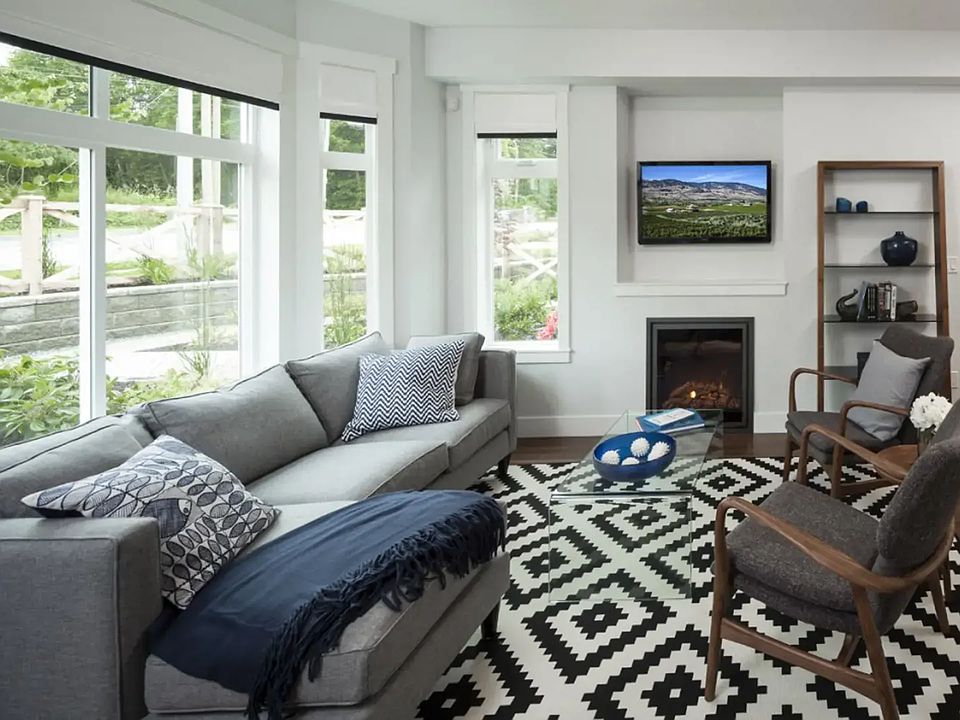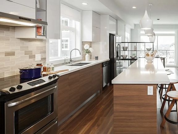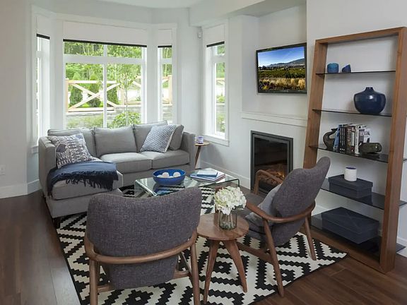 Very comfortable 3 bedroom 3 bath unit, shows as almost brand new. Still furnished with the original high-end showsuite furnishings. Walk to get groceries and essentials. Great location close from Hwy 10, 152 and King George, gets you anywhere fast. Beautiful vaulted ceiling master bedroom, double closets, full ensuite bath. 2 extra bedrooms with full bath. Main level you will find a living room with fireplace, powder room, gorgeous quartz countertops, stove, dishwasher, microwave and double door fridge all in stainless steel. Dining room with deck overlooks the Coastal mountains. Basement level you will find a secure double tandem garage and lots of storage. Corner unit, beautiful, bright with modern Scandi design laminate flooring and finishings. Looking for renters who are respectful, clean, small pet permitted, have good references, not partiers. References a must. Small yard in front as well.