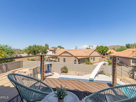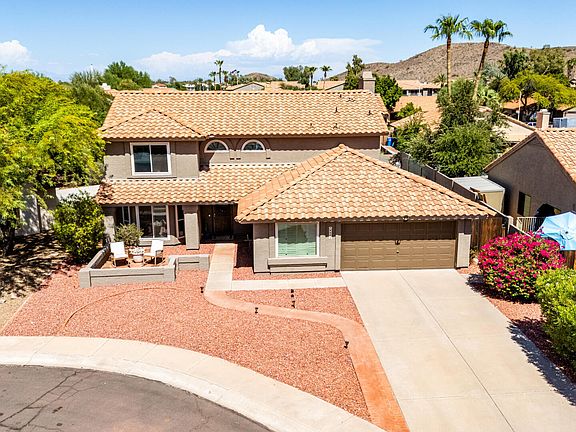 Experience the best of Ahwatukee living in this grand MPR home w/sparkling pool & spa plus newer HVAC! Located in a quiet interior cul-de-sac lot & top-rated Kyrene School District, you'll enjoy unparalleled access to hiking trails, greenbelts, playgrounds & 3 pools/spas. This highly desirable community also offers volleyball, tennis & pickleball, w/shopping, dining & major freeways just min away. Inside, discover a grand entrance w/vaulted ceilings, spacious layout w/4 beds, 2.5 baths, formal dining & 2 living areas. Recently updated w/fresh paint, plus new wood-look plank tile t/o main level & newer carpeting upstairs, this home is truly move-in ready! Gourmet kitchen featuring a center island, lazy Susan & all appliances included, opens to the family room w/a quaint brick fireplace! The primary bedroom allows for the perfect private retreat, with dual closets and a balcony overlooking the gorgeous mountain views that Ahwatukee is so famous for! The ensuite bathroom has been updated with a tiled shower & separate tub, dual sinks, and a built-in vanity space for your convenience.