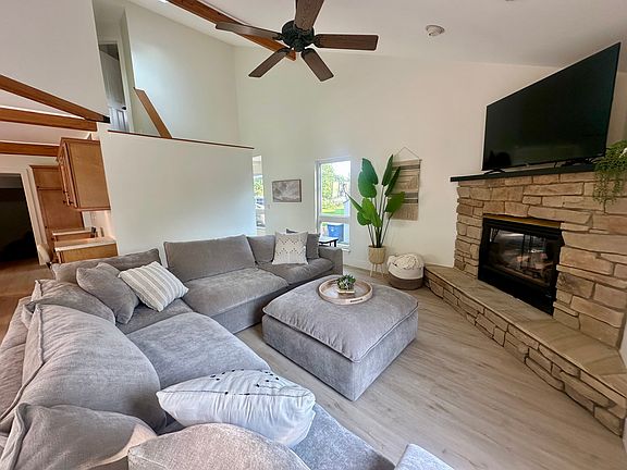 On the lower level, enjoy a cozy living room with large, stone gas fireplace. Full kitchen completely stocked with pots, pans, silverware, plates, glassware and all cooking utensils. Brand new stainless steel appliances.