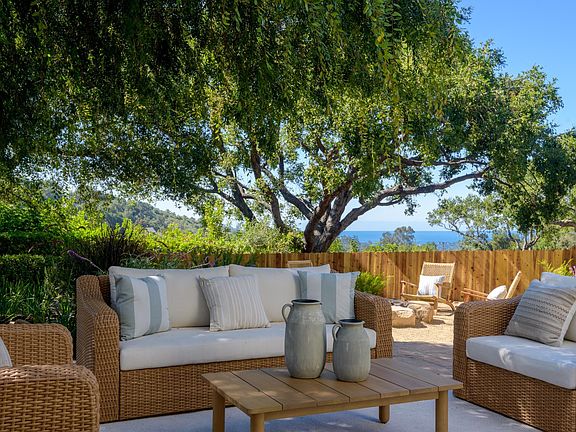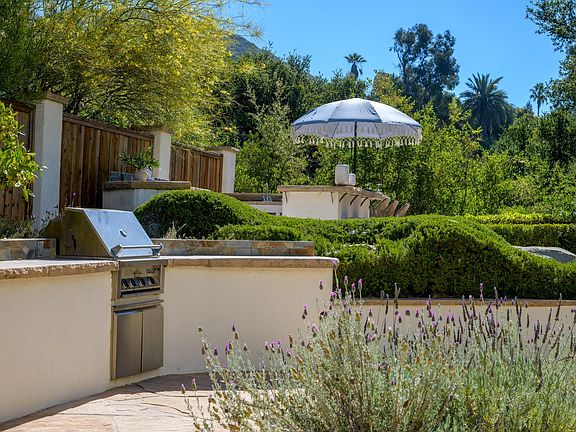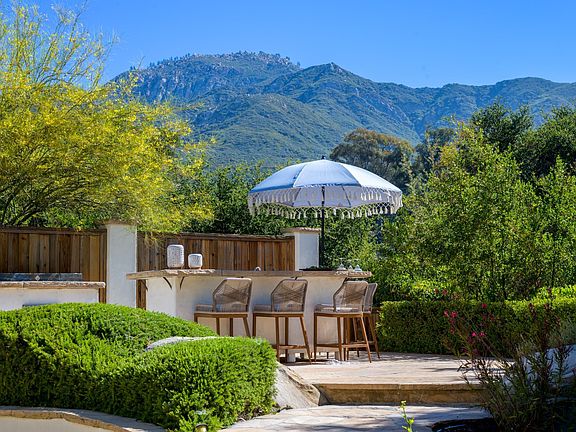 Upstairs, the primary suite is a tranquil escape with ocean and island peeks, mountain views, walk-in closets, and an elegant en-suite with tumbled Italian marble. A convenient laundry chute leads to the spacious laundry room below. All ground-floor rooms open to the expansive patio or wraparound deck creating a true indoor-outdoor lifestyle. The lushly-landscaped, park-like backyard is designed for entertaining, complete with dining and sitting areas, BBQ and bar, fire pit, fruit trees, and manicured lawn. Additional features include a brick paver driveway, automated irrigation system, new south fence, and the privacy of a secluded yet convenient location just 11 minutes from downtown. Experience the magic of Santa Barbara living - sun-drenched patios, lush gardens, and the effortless rhythm of an indoor-outdoor lifestyle you'll never want to leave.
