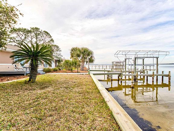 Exquisite waterfront home boasting panoramic views from every angle, with water on two sides, offering tranquility and stunning sunsets. Recently renovated post-Sally, this split floor plan gem features a meticulously maintained HVAC system, Granite counters installed in 2009. Step into the elegant 10x12 office with views of lost key. Enjoy expanded living space with a 10ft extension at the rear, leading to a sprawling 40x52ft deck perfect for entertaining. Aluminum hurricane shutters convey. Complete with a convenient boat lift and dock, this home epitomizes coastal living at its finest.