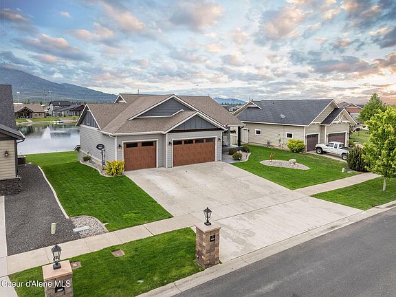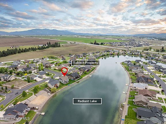 Welcome to this stunning 4BD/3BA rancher with a walk-out basement, nestled in the prestigious gated community of Radiant Lake. Built in 2017 and situated on a .27-acre waterfront lot, this 3,650 sq.ft. home perfectly blends comfort, style, and year-round recreation. The kitchen features quartz countertops, stainless appliances, & walk-in pantry. Enjoy morning coffee or evening sunsets on the deck overlooking the water. The spacious master suite offers lake views, dual vanity sinks, soaker tub, step-in shower, and a generous walk-in closet. Storage abounds with a 3-car garage, laundry/mud room, craft/bonus/potential 5thBD upstairs, and 2 storage rooms downstairs as well as another bonus/media room. Additional highlights include central A/C, a welcoming covered front porch, & wiring for a whole-house generator. Radiant Lake offers an exceptional lifestyle with 5 waterfront parks including sport courts, a covered pavilion, and BBQ/picnic areas. Engage in vibrant community events throughout the year or take full advantage of the private lake with activities like swimming, paddle boarding, kayaking, fishing, and even possible ice skating in the winter. Don't miss your opportunity to live on the water in one of Rathdrum's most sought-after neighborhoods!