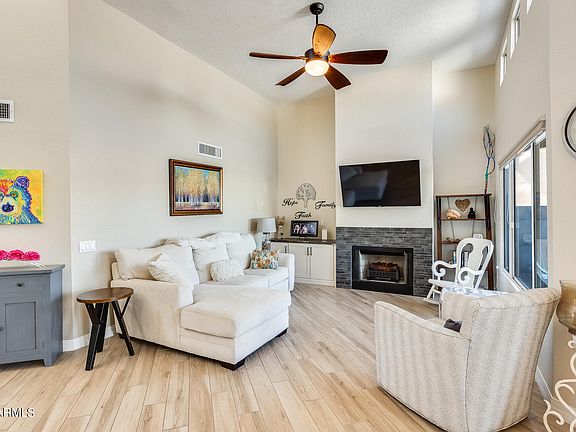 Completely remodeled Valencia Territorial w/2BR/2BA PLUS Den/Office. Unique floorplan with split bedrooms and baths provides privacy with large living space in Great Room, Entry and Dining Area. Remodeled kitchen features 42'' cabinets w/soft-close drawers & doors, SS appliance Granite and custom cabinets throughout. Wood-look tile main areas; carpet in bedrooms. Tall baseboards, electric fireplace. Garage cabinets and ''no salt'' water softener. Water heater circulation pump and timer. newer garage door opener and spring. Nice landscaped yard w/travertine patio, artificial grass, auto sprinkler Sun Village, is a gated, security guarded, age 55+, community, in the city of Surprise, Arizona. This small community is made up of just under 1400 homes and condominiums. The Sun Village Community has an 18 hole, par three "no-"riding" golf course, an heated swimming pool and spa, tennis, pickle ball and shuffleboard courts, horseshoe pits, an exercise room, a billiards room, sewing and crafts rooms, and a ballroom where national and international entertainment can be enjoyed.