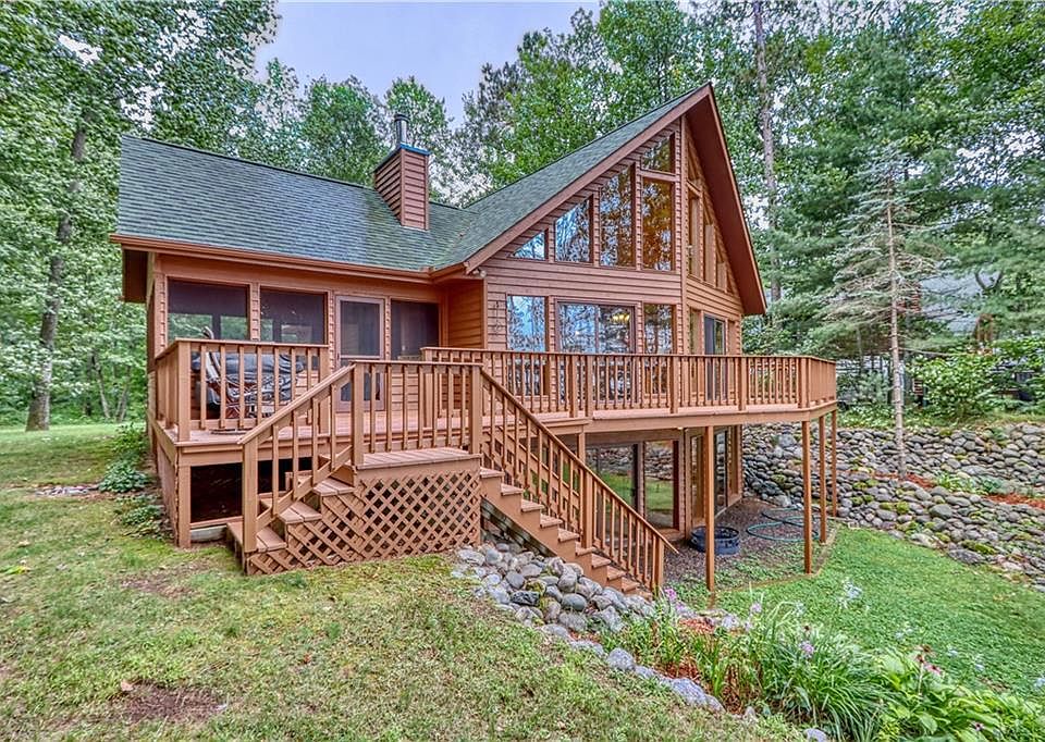 Northerly exposure on this clear-water, full-recreation lake that connects to Lac Courte Oreilles via Grindstone Springs. This meticulously kept updated chalet-style lake home has large windows that flood the main floor w/ light & warmth. The main level is an open concept kitchen/dining/living room. Two bedrooms and a full bathroom round out the main level. The loft consists of a large main bedroom suite with a full bath including a spa tub. Check out the extra bunk space in the lower-level bedroom plus the large rec/game room that walks out to ground level. Enjoy evenings on the large, finished screen porch or take in the views from the expansive lakeside deck. This property is fully furnished! There is room for a detached or attached garage on the property. Grindstone Lake is 3100+ acres with two islands and 10.5 miles of shoreline. Septic is sized for a 3 bedroom.