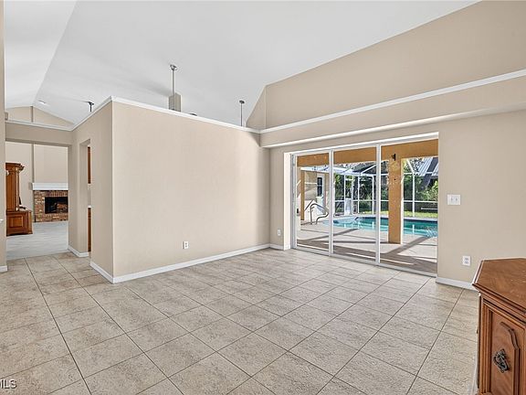 The separate formal dining room is ideal for family gatherings or dinner parties. As you move toward the heart of the home, you’ll find a bright, open kitchen equipped with granite countertops, abundant cabinet space, and a convenient breakfast bar. The kitchen overlooks a large, inviting family room complete with a charming wood-burning fireplace—a cozy and rare feature in Southwest Florida.