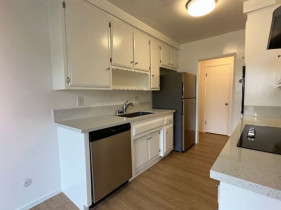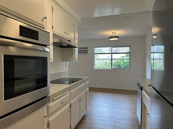 Extra large and newly refreshed 1 bedroom, 1 bath complete with laminate flooring throughout. Modern galley kitchen with quartz countertops, stainless steel fridge, wall oven, cooktop and dishwasher. Separate dining area right off the kitchen leads to a generous main living room with an AC/Heat unit and large double pane windows with horizontal blinds to control great natural light. The hallway is equipped with deep built in storage/linen cabinets. The spacious bedroom has a large wall to wall closet, dual combo AC/Heater unit, and double pane window with a black out shade. The bathroom has a huge quartz countertop vanity with plenty of storage, newly tiled shower with a separate tub and beautiful tile floor. Last but not least is a huge walk-in closet near the entrance.