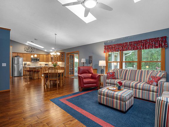 Inside, vaulted ceilings and skylights create a bright, open great room that flows seamlessly from the living area to the dining space, creating a perfect setting for entertaining. The spacious kitchen is a delight, boasting an island with seating, ample counter space, and stainless steel appliances. Adjoining the dining area, an inviting sunroom provides a spot to enjoy your morning coffee while overlooking the wooded backyard.