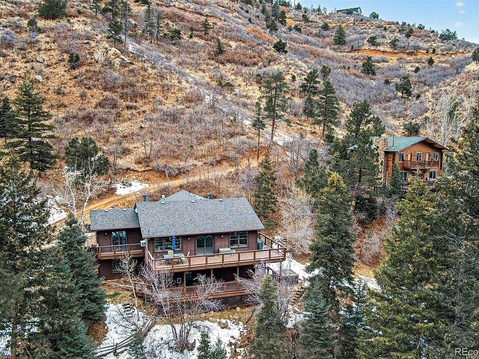 Welcome to this beautiful, custom lower Crystal Park home nestled into the mountainside on over half an acre with Sutherland Creek babbling along just across the road! This exceptional 4 bedroom, 3 bathroom, 2 car oversized garage home is located in the exclusive gated Crystal Park community that offers a rare blend of privacy and seclusion with easy access to Manitou Springs (under 10 min to downtown) and Colorado Springs (15-20 min to downtown)! Boasting 2,612 square feet, the residence is designed to maximize its stunning natural surroundings with mature trees, the soothing sound of nearby Sutherland Creek, and sweeping mountain views. The interior features a thoughtful layout including a walk-out basement, a spacious living room with vaulted ceilings plus a wood burning fireplace, dog run and functional upgrades like a reverse osmosis water treatment system and water softener. Relax on the expansive upper or lower wraparound decks, soak in the hot tub, or retreat to the main level primary suite, which features its own private deck overlooking the surrounding forest. Living in Crystal Park is a lifestyle like no other. This exclusive 2,000-acre gated community provides residents with premium amenities, including a stocked trout pond, miles of private hiking trails, tennis and pickleball courts, a heated seasonal pool, and a clubhouse. The HOA also covers essential mountain services like snow removal, road maintenance, and trash service. Enjoy total peace and quiet in this amazing location, all while being just minutes from the heart of Manitou Springs and Colorado Springs. A perfect mountain sanctuary! Don't miss your opportunity to see this home!