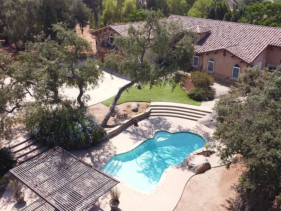 Check out this Price Improvement! Beyond a private, gated entry lies a world meant for gathering, living, and dreaming. On a flat, useable acre framed by mature trees and golden westerly sunsets, three distinct residences create a rare multi-generational haven. The Tuscan-inspired main home, rich with high ceilings, 8-foot custom doors, earth-toned finishes, and sunlit spaces, invites you to linger—whether by the family-style kitchen with its granite island and black cabinetry, or fireside under the stars beside the newly built-in firepit. The permitted loft above the garage transforms into a chic studio rental, while the cottage-inspired front home offers two bedrooms, a warm fireplace, and a private walled patio. Between them, a pool house with bath and laundry stands ready for summer days beside the sparkling inground pool. With 7 bedrooms, 5.5 baths, and over 5,400 sq. ft. of living space, this compound offers 5 laundry facilities, 2 septic systems, paid-off 38-panel solar, paved RV parking with hookups, and an oversized driveway for endless guests. Wander the small orchard—avocado, grapefruit, lemon, lime, apricot—and imagine more. Here, life is secure, serene, and full of possibilities, where privacy meets connection in perfect harmony.