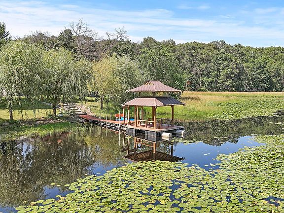 This charming home is nestled in a serene natural setting beside a tranquil pond, offering stunning views year-round. Its design emphasizes natural light with large windows that invite the outdoors in. A spacious deck and dock provide perfect spots for relaxation or enjoying the water. Inside, a cozy wood-burning fireplace adds warmth and ambiance. Additionally, there's a bunkhouse for guests and a pagoda, enhancing the property's unique appeal and providing versatile spaces for gatherings or quiet contemplation.