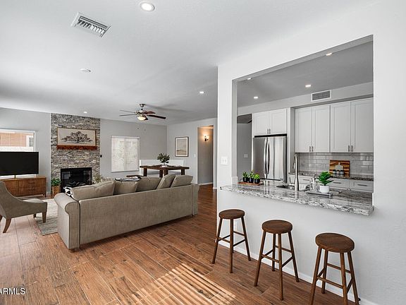 Welcome to this beautifully updated 4-bedroom, 2.5-bath, two-story home nestled on a scenic hillside cul-de-sac lot with pool and spa. Offering the perfect balance of comfort and style, this home features modern hardwood-look porcelain tile, granite countertops, and brand-new white soft-close shaker cabinets with upgraded backsplash in both the kitchen and bathrooms. The spacious kitchen opens to the family room, highlighted by a striking ledger stone fireplace and bright natural light. Upstairs, the primary suite includes a beautifully tiled walk-in shower and views of the surrounding mountains. Additional upgrades include two Trane AC units (2020), updated appliances, and a brand-new washer and dryer that convey with the house. Enjoy Arizona outdoor living on the tiled back patio overlooking the pool and spa. Conveniently located near I-10, 202, and the new South Mountain Freeway with quick access to downtown Phoenix. This move-in ready home offers space, style, and location!