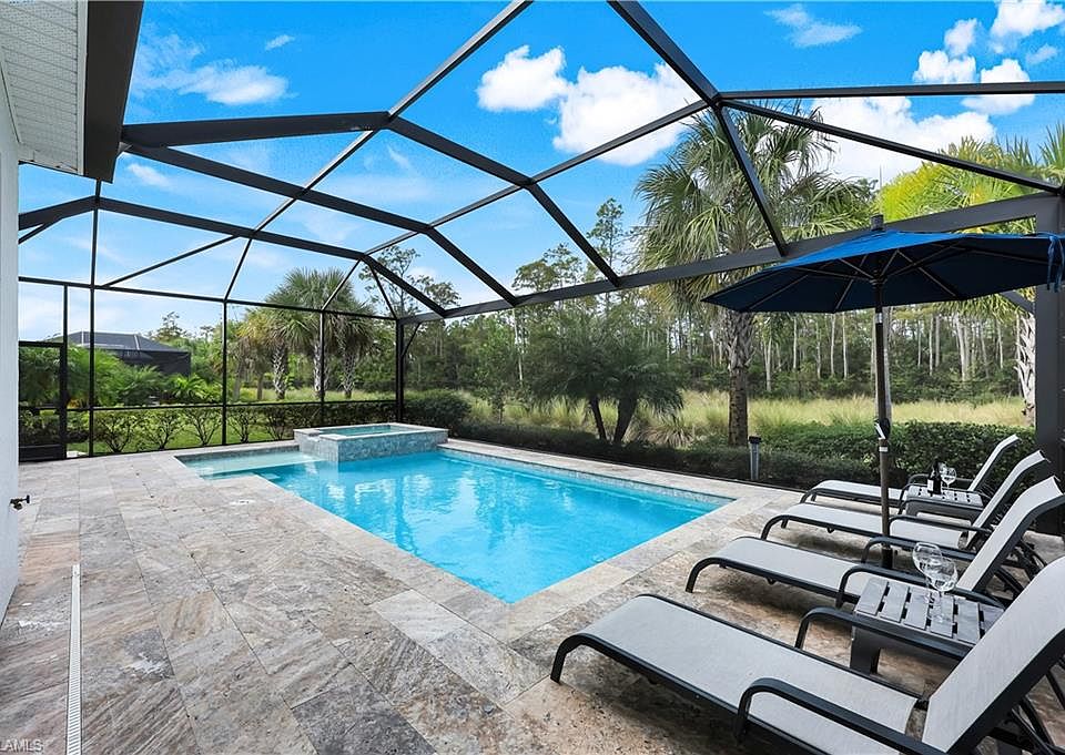 Least expensive home in Vista Blue! Fresh, Fabulous, and TURNKEY FURNISHED! This stunning home is situated on a spacious lot overlooking the preserve, offering privacy alongside the soothing sounds of nature. The open floor plan offers excellent entertaining possibilities, featuring a great room anchored by a large island and sliding doors that lead to the lanai, which overlooks a beautifully designed custom pool and spa. With 4 bedrooms and 3 full baths, there is ample space for family and guests to unwind. The home showcases fully tiled flooring and elegant tray ceilings, demonstrating meticulous attention to detail and custom finishes throughout. The summer kitchen, equipped with a built-in grill, enhances outdoor enjoyment, making it an ideal addition to your Southwest Florida lifestyle. Natural gas is a fantastic feature of Vista Wildblue, and the nearby lakes and amenities provide opportunities for relaxation and entertainment. The area is rich with shopping and dining options, and RSW Airport is easily accessible. You'll find yourself conveniently located near the sandy Gulf beaches, downtown Naples, and the River District in Fort Myers.