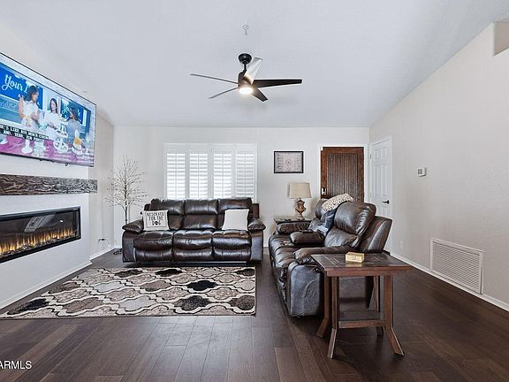 Fenced poolElectric fireplaceWhite cabinetsPlantation shuttersQuartz countertopsWood flooringStainless steel appliances