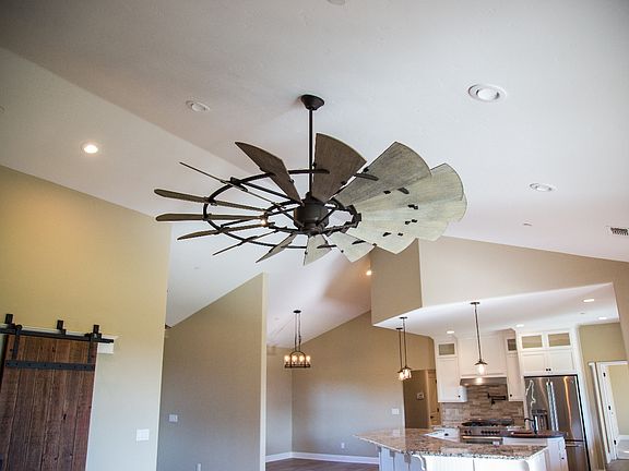 CUSTOM BUILT RANCH STYLE HOME WITH LOTS OF BELLS AND WHISTLES. RESAWN OPEN BEAMED ENTRY WAY, T & G CEDAR AND RUSTIC METAL ACCENTS ALONG WITH STAMPED CONCRETE AND DEER ANTLER CHANDELIER SET THE STAGE. INSIDE, THE FOYER OPENS INTO THE MIDDLE OF THE GREAT ROOM. ENGINEERED HARDWOOD FLOORS INVITE YOU INTO THE MASSIVE BREAKFAST BAR THAT CAN COMFORTABLY SEAT 8 OR THE LIVING ROOM THAT SITS UNDER A CUSTOM 6 FT CEILING FAN THAT LOOKS LIKE A WINDMILL. THE DINING AREA IS SEPARATE AND DEFINED, YET OPEN TO THE KITCHEN. THE 4TH BEDROOM/OFFICE IS EASILY CLOSED OFF FROM THE GREATROOM WITH SLIDING RECLAIMED BARNWOOD DOORS. THE KITCHEN COMES WITH CHEFS GRADE 36" RANGE AND HAS A POT FILLING FAUCET, A REFRIGERATOR THAT HAS A COFFEE MAKER IN THE DOOR AS WELL AS INSTANT HOT AND COLD WATER AND ICE, AND A STACKED DOUBLE DRAWER DISHWASHER. CUSTOM CABINETRY FEATURES UPPER DISPLAY CABINETS TO SHOW OFF YOUR FAVORITE COLLECTIBLES AND BUILT IN TRASH AND RECYCLING BINS. THE BUTCHER BLOCK ISLAND WITH COPPER PREP SINK IS A GORGEOUS CENTERPIECE TO THE ONE OF A KIND KITCHEN. THE MASTER RETREAT BOASTS TALL VAULTED CEILINGS AND A BATH WITH HIS AND HERS WALK IN CLOSETS. THE CLAW FOOT SOAKING TUB HAS ITS OWN CRYSTAL CHANDELIER AND FEELS LIKE A SPA. THE SHOWER HAS TWO HEADS AND THE FRAMELESS HEAVY GLASS DOOR MAKES IT FEEL OPEN TO THE ROOM. THE TILE FLOOR IS HEATED AND THERE ARE CUSTOM FAUCETS THAT LOOK LIKE OLD FARM HAND WATER PUMPS. LOTS OF BUILT IN STORAGE! THE LAUNDRY ROOM DOUBLES AS A MUD ROOM AS IT'S JUST OFF THE GARAGE AND COMES WITH A FOLDING COUNTER, HANGING ROD, STORAGE GALORE AND A BENCH COMPLETE WITH COAT HOOKS. THERE IS A POWDER ROOM WITH LOTS OF HIDDEN STORAGE. ON DEMAND HOT WATER, SO NO RUNNING OUT. BOTH SPARE BEDROOMS HAVE LARGE CLOSETS WITH BUILT INS AND CEILING FANS. HALL BATH HAS HEATED FLOORS AS WELL. HUGE PATIO FOR ENTERTAINING.UPSTAIRS THERE'S A BONUS ROOM THAT HAS SEPARATE HEATING AND AC. OVERSIZED 3 CAR GARAGE AND A LARGE STORAGE CLOSET. LAWNS ARE IN, SPRINKLERS TOO.
