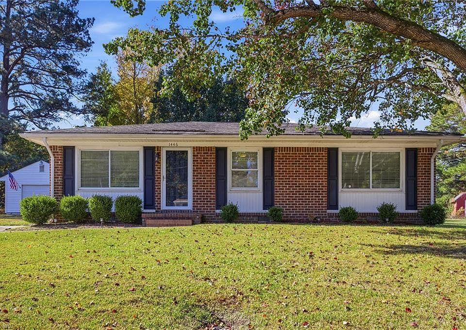 Welcome home to this beautifully updated 3-bedroom, 2-bath brick ranch, perfectly situated on a spacious half-acre lot in a quiet Suffolk cul-de-sac. This home features a new HVAC system, stainless steel appliances, and a stunning kitchen with granite countertops, custom cabinetry, and a modern tile backsplash. Both bathrooms have been tastefully renovated with new vanities and fixtures, and the private ensuite offers a relaxing retreat. The fully operable detached garage/workshop with power for storage, hobbies, or projects. Enjoy peaceful outdoor living with plenty of yard space for entertaining, gardening, or play. Conveniently located near the Shipyard, military installations, and all of Hampton Roads making it a perfect choice for service members or commuters alike. This move-in-ready Suffolk gem is ready to welcome you home!