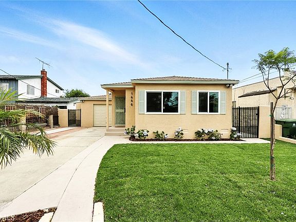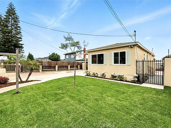 A perfect home reimagined just for you with gorgeous detail around every corner, you'll find beautiful designer details that will knock your socks off! Remodeled kitchen features quartz countertops, designer backsplash & gorgeous light sage coping, new stainless steel appliances including gas range with 4 regular burners & a high power center burner & removable griddle, farmhouse sink complete with disposal, built-in trash cabinet, refrigerator, white wooden cabinetry, substantial black hardware, glass faced cabinetry, pantry, white washed laminate flooring, storage, recessed lighting, new fixtures & space that is easy to navigate as you cook! The laundry room is off the kitchen & features a side door to backyard access, washer & dryer hookups as well as tons of cabinets & recessed lighting. The entire home has brand new dual paned windows that keep the space light & airy. Dining room is adjacent to kitchen for easy serving with trendy boho chic drop down light fixture, & right in front of a huge window overlooking the newly landscaped front yard. The entire house has easy care white washed laminate flooring, large baseboards, & was freshly painted too. The bathroom is a jaw dropping masterpiece with decorator tile floors, whitewashed wooden vanity, designer shower subway tile & recessed toiletries shelf to match those floors, dark fixtures & hardware throughout, light up large vanity mirror & more! Both bedrooms are good sized, both are staged with queen sized beds & you will find a ton of space all the way around the room too, mirrored closet doors & deeper than expected closets round out the rooms. Family room is warm, inviting & open to the dining room which gives the floor plan an easy flow & don't forget about the brand new google thermostat that you can operate from your phone! Exterior of home is freshly painted & mirrors the soft sage accent colors within the home as well as the neutral beige that goes with every type of decor. Front yard has parking for at least 3 cars in the driveway plus an attached 1-car garage which has garage door opener. Front yard has automatic sprinklers & drip line system, fresh plantings, a jacaranda tree & beautiful lush sod. On the left side of the house find storage cabinets built in which makes it easy to store holiday items etc. Sides of the house are flanked by wrought iron gates leading to a large covered patio that goes the length of the house and a really nice sized yard! Close to 110 & public transportation!
