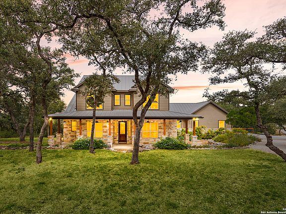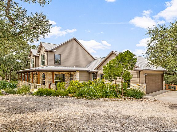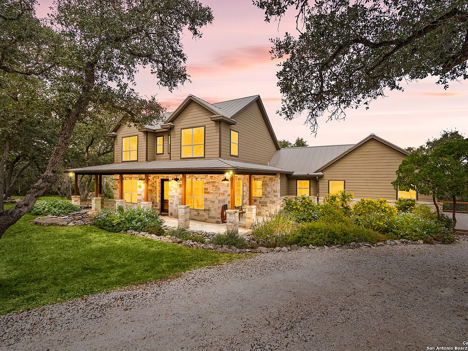 This two-story custom-built home sits on 4.85 acres in the gated and peaceful community of Retalbo Ranch. Surrounded by mature oak trees, the property offers privacy, natural beauty, and plenty of room to enjoy outdoor living. The first floor features a spacious living room with a custom floor-to-ceiling fireplace, outside access, and a wall of windows that fill the space with natural light. The living area flows into the kitchen and dining space, accented with a beamed ceiling. The kitchen includes stainless steel appliances, gas cooking, a walk-in pantry, breakfast bar, and generous counter and cabinet space. A separate study provides an ideal spot for a home office or quiet retreat. The split primary bedroom is also on the first floor, offering a private ensuite bath, along with a secondary bedroom and full bath. Upstairs, you'll find two additional bedrooms and a second living area, perfect for a media or game room. Both front and back covered porches extend the living space outdoors. The backyard is designed for gatherings, with a large covered and open patio/deck offering treetop views of the Hill Country, an additional patio with a firepit, a sprawling lawn, and shady oak trees. Additional highlights include an oversized insulated two-car garage, insulated garage door, and the comfort of a serene community setting. This property combines space, function, and natural surroundings-schedule your personal tour today!