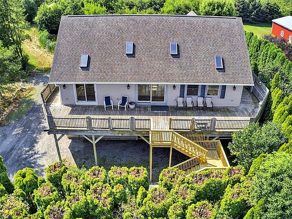 Perched high on a double 200' Lakefront lot with eagles nest view of Lake Ontario! 1/4 mile from the county Marina and restaurants, this 3-story custom home offers a rare blend of luxury, space and versatility. Designed for elevated living, the second floor main living area delivers breathtaking, unobstructed, birds eye views of the water; visible through walls of windows and from the expansive wraparound deck! The perfect vantage point to watch boats, freighters and spectacular sunsets! Electric power runs to waters edge. Steel staircase.