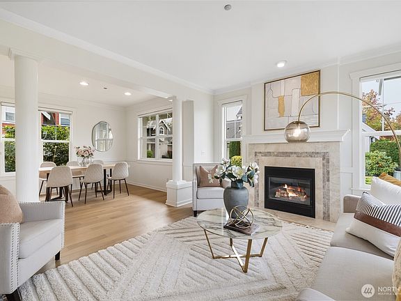 Cozy gas fireplaceSun-drenched modern craftsman townhouseSpacious kitchenEngineered hardwood floorsFormal dining roomQuartzite countertopsWood cabinets